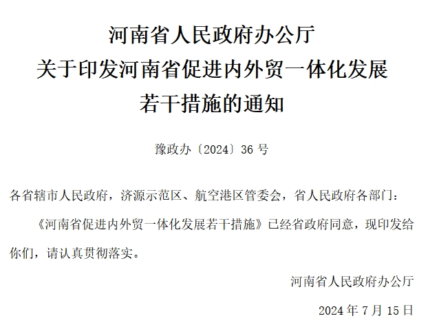 河南省人民政府辦公廳 關(guān)于印發(fā)河南省促進內(nèi)外貿(mào)一體化發(fā)展 若